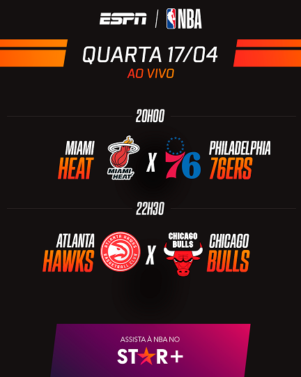 Às 20 horas, Conrado Giulietti e Helen Luz entram ao vivo na ESPN 2 para exibir o confronto entre o oitavo colocado da Conferência Leste Miami Heat e o sétimo, o Philadelphia 76ers. O vencedor dessa partida está garantido nos playoffs da NBA.