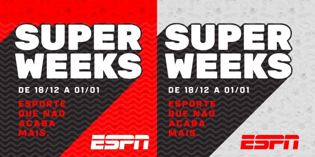 A programação recheada de fim de ano nos canais ESPN denominada de ‘Super Weeks’ será realizada pelo terceiro ano consecutivo. Nos dois últimos anos, a ESPN liderou a audiência entre os canais de TV paga durante o período, tendo impactado mais de 5 milhões de pessoas em 2018. No digital, os números de audiência também registraram recordes na quantidade de dispositivos que acessaram o WatchESPN e o ESPN App, aplicativos para transmissão simultânea e conteúdo mobile do portal ESPN.com.br, respectivamente.