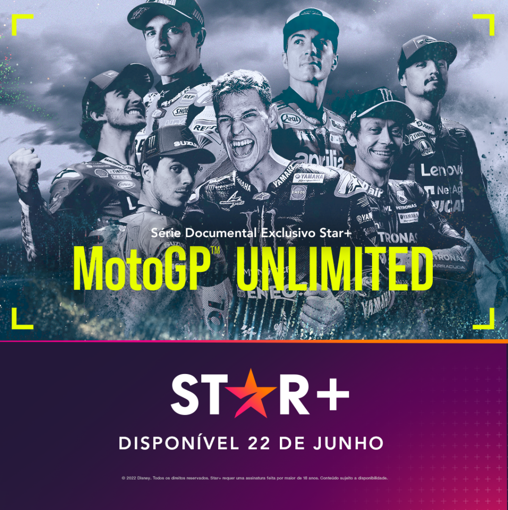 O MotoGPTM Unlimited estreará exclusivamente no Star+ em toda a América Latina na quarta-feira, 22 de junho. A série documental, produzida pela THE MEDIAPRO STUDIOS e DORNA, oferece um olhar único e exclusivo sobre tudo o que acontece no Campeonato Mundial de MotoGPTM, dentro e fora das pistas.