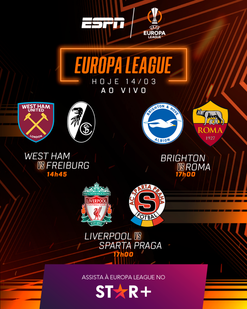 Nesta quinta-feira (14), a UEFA Europe League e UEFA Europa Conference League são as principais atraçõeso dos canais ESPN e da plataforma de streaming Star+ para os fãs de futebol internacional. Os times disputam duas das competições mais tradicionais da Europa, e os fãs da modalidade acompanham de forma exclusiva duelos decisivos pelos dois torneios, como as partidas entre West Ham x Freiburg e Rangers x Benfica.
