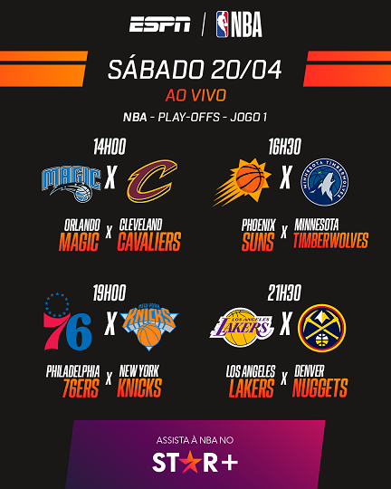 De 20 a 28 de abril, as plataformas de esporte da Disney exibirão 14 partidas exclusivas dos Playoffs para todo país, e já no primeiro dia da pós-temporada serão quatro jogos: Magic x Cavaliers, Suns x Timberwolves, 76ers x Knicks e Nuggets x Lakers.