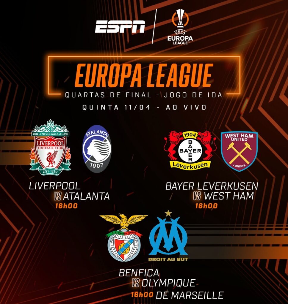 Dois dos clubes mais vencedores do futebol mundial estarão em destaque nas quartas de final da UEFA Europa League. O torneio tem 100% de seus jogos sendo exibidos pela ESPN e Star+ para o Brasil e nesta quinta-feira (11), Liverpool e Milan estarão em ação contra Atalanta e Roma respectivamente às 16h.