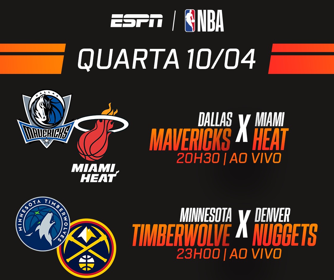 A partida inicial da rodada dupla desta quarta-feira (10) será o embate entre Dallas Mavericks e Miami Heat. O time do Texas, liderado por Luka Doncic, poderá consolidar sua vaga nos playoffs com a quinta colocação do Oeste. Já a equipe da estrela Jimmy Butler tenta escapar do Play-In. O jogo será exibido ao vivo às 20h30 com Conrado Giulietti e Zé Boquinha.