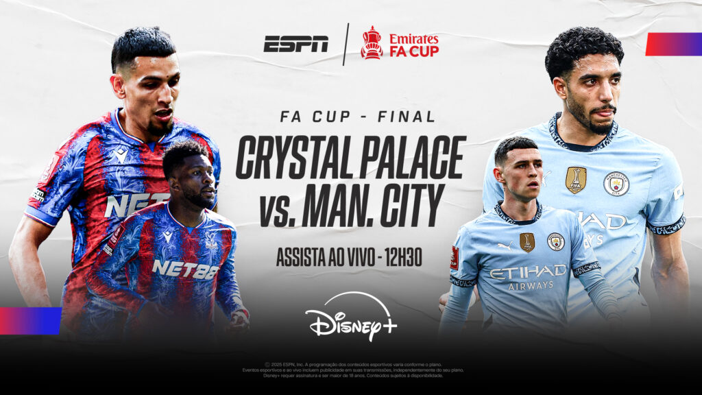 A ESPN exibe neste sábado, 17 de maio, a grande final da Copa da Inglaterra 2024/25, com transmissão ao vivo a partir das 12h30 no canal e na plataforma de streaming Disney+. O duelo decisivo será entre Manchester City e Crystal Palace, no lendário estádio de Wembley, em Londres. O jogo terá narração de Rogério Vaughan, comentários de Mário Marra, análise de arbitragem de Carlos Eugênio Simon e cobertura in loco de João Castelo Branco.