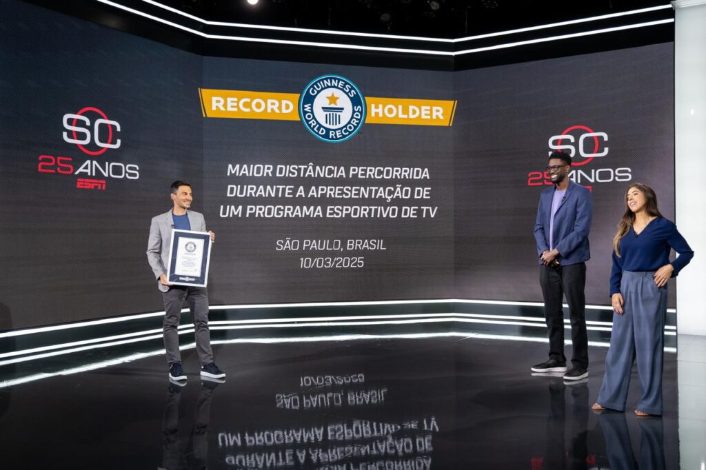 Nesta quinta-feira (06), o SportsCenter recebeu o certificado do Guinness World Records pela ação inédita realizada no Dia Mundial da Conscientização contra o Sedentarismo. A iniciativa colocou os apresentadores da principal atração da ESPN correndo por cerca de 30 minutos, em vez de ficarem sentados atrás da tradicional bancada.